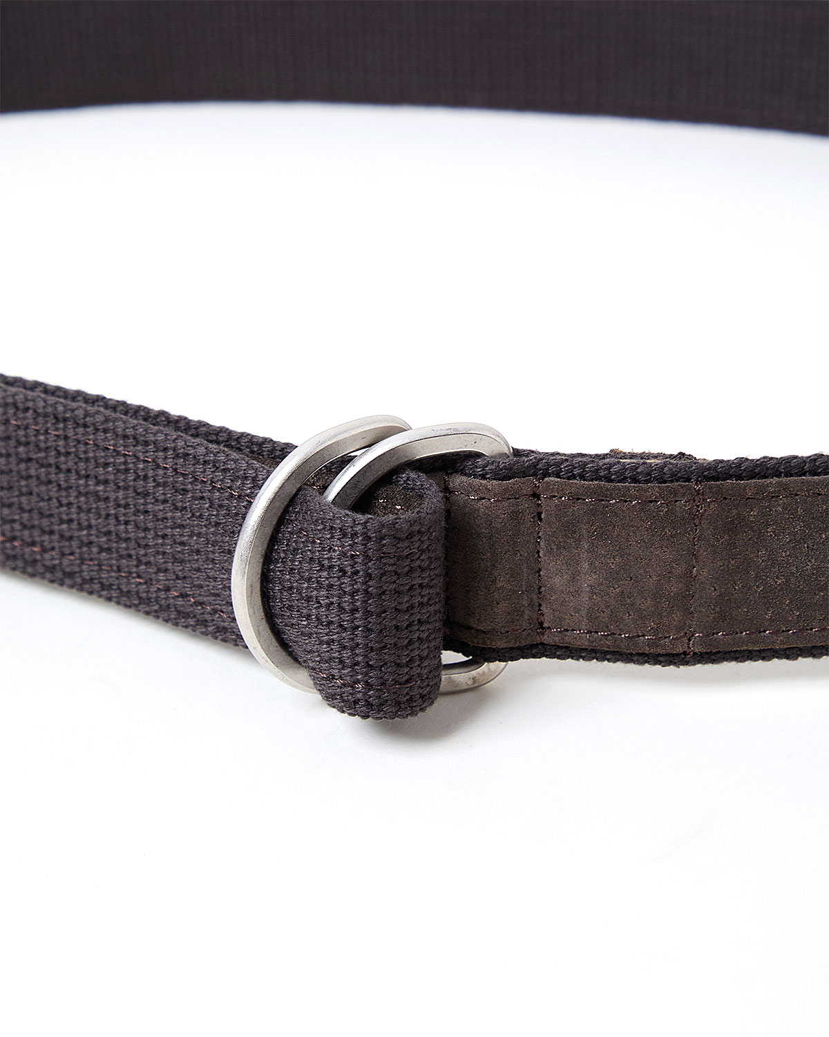 バッグで使用されるピッグスエードを使用したダブルリングベルト。バッグのストラップに使用される耐久性の高いアクリルテープを貼り合わせ、強度とデザインを両立しています。真鍮性のバックルはややフラットな造型とマットなシルバー仕上げに。スタイルを問わない25mm幅です。