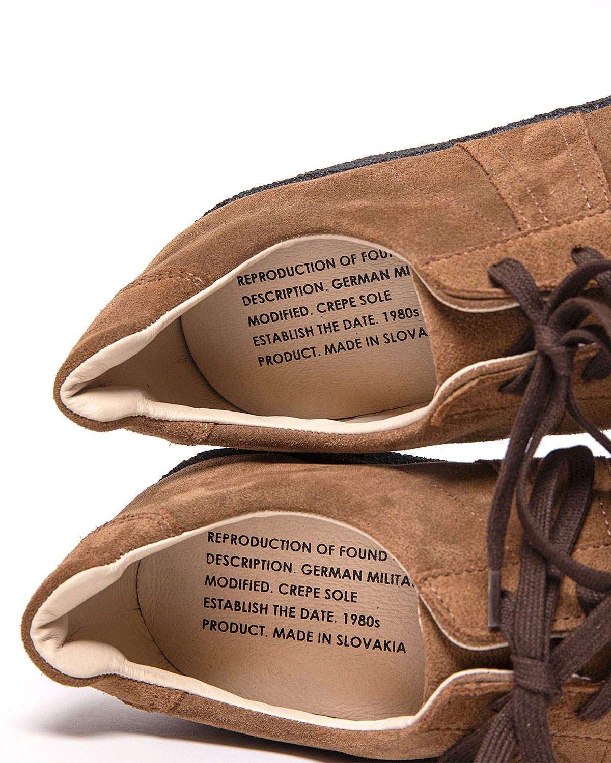 「見つけ出し(FOUND)、再現する(REPRODUCTION)」をコンセプトに、2016年にスタートしたブランド。代表的な「ミリタリートレーナーシリーズ」は、1950~1990年代に軍用トレーニングシューズを生産していた欧州各国のファクトリーにて、一つひとつ丁寧にハンドメイドで生産されています。ロゴやタグに、品名、国名、年代を記載することで、デザインソースとなった元のモデルへのリスペクトを表明しています。ミリタリーアイテムだけでなく、時代を超えた普遍的なデザインのアイテムを見つけ出し、現代的な解釈で再現しリリースしています。