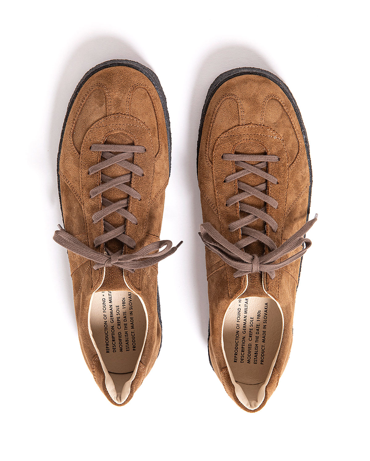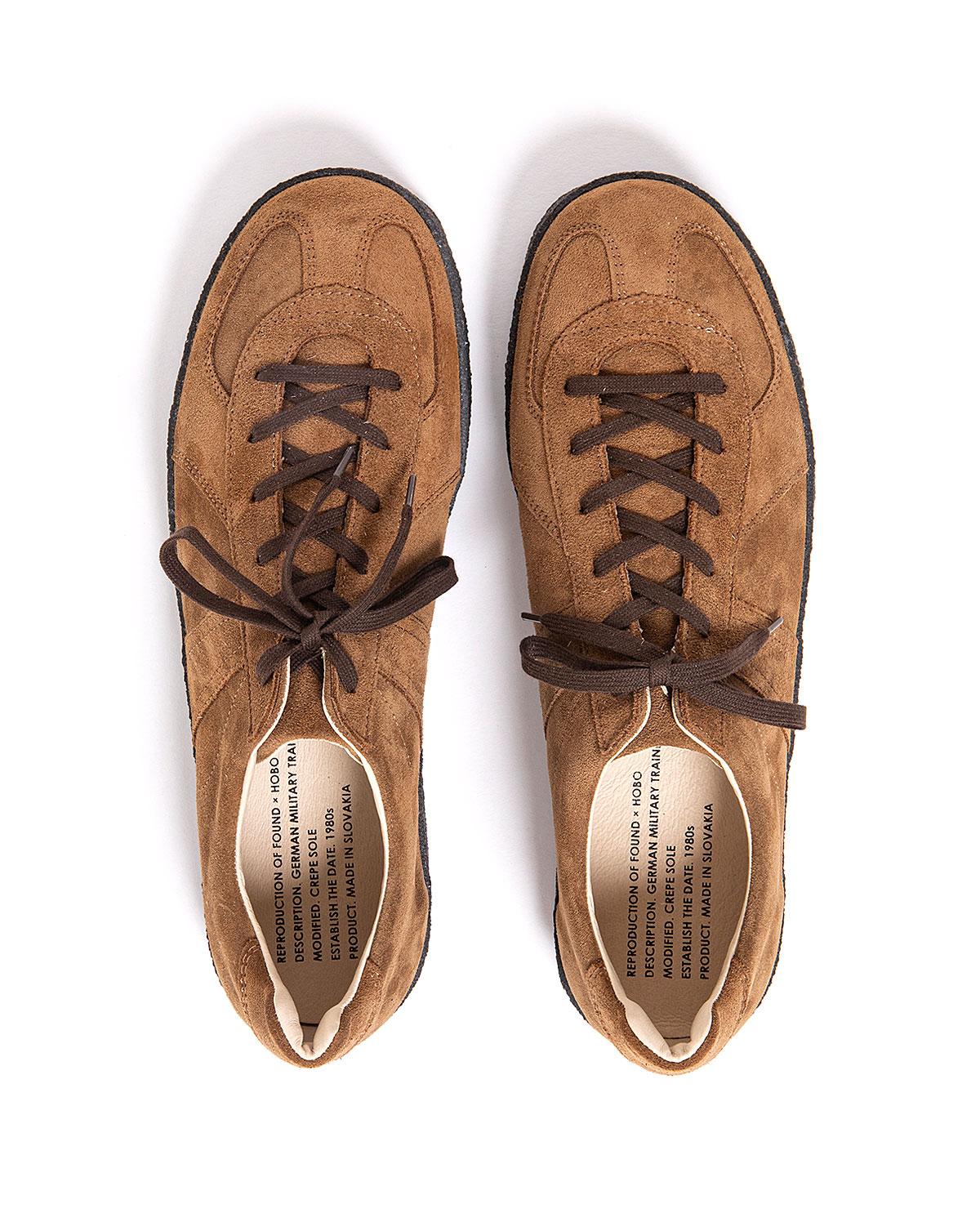 1970~1980年代に西ドイツ軍が室内用のトレーニングシューズとして使用していたスニーカー「ジャーマントレーナー」。オリジナルを踏襲した生産背景を使用し、スロバキア製の木型で製作される〈REPRODUCTION OF FOUND〉を代表するモデルを、hoboが上質なレザーシューズへとアップデートしました。アッパーには1958年創業のイタリア最大規模を誇るタンナー・MASTROTTO社のスウェードレザーを採用。革質の良さはもちろん、滑らかで繊細な毛足と美しい発色が特徴です。ソールはオリジナルのガムソールからナチュラルクレープソールへとアレンジし、厚みを持たせたサイドテープがボリュームあるシルエットを生み出しています。