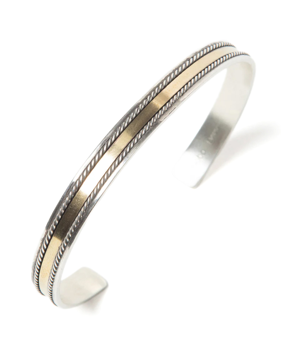 細やかなロープ状のシルバーでブラス製のプレートを挟んだ、異素材によるコンビネーションブレスレットです。国内生産ならではの精緻な造型が素材の美しさを引き立てており、使用していくことでシルバーとブラスの異なる経年変化も楽しんでいただけます。単体はもちろんのこと重ねてもつけ易い7mm幅となっています。