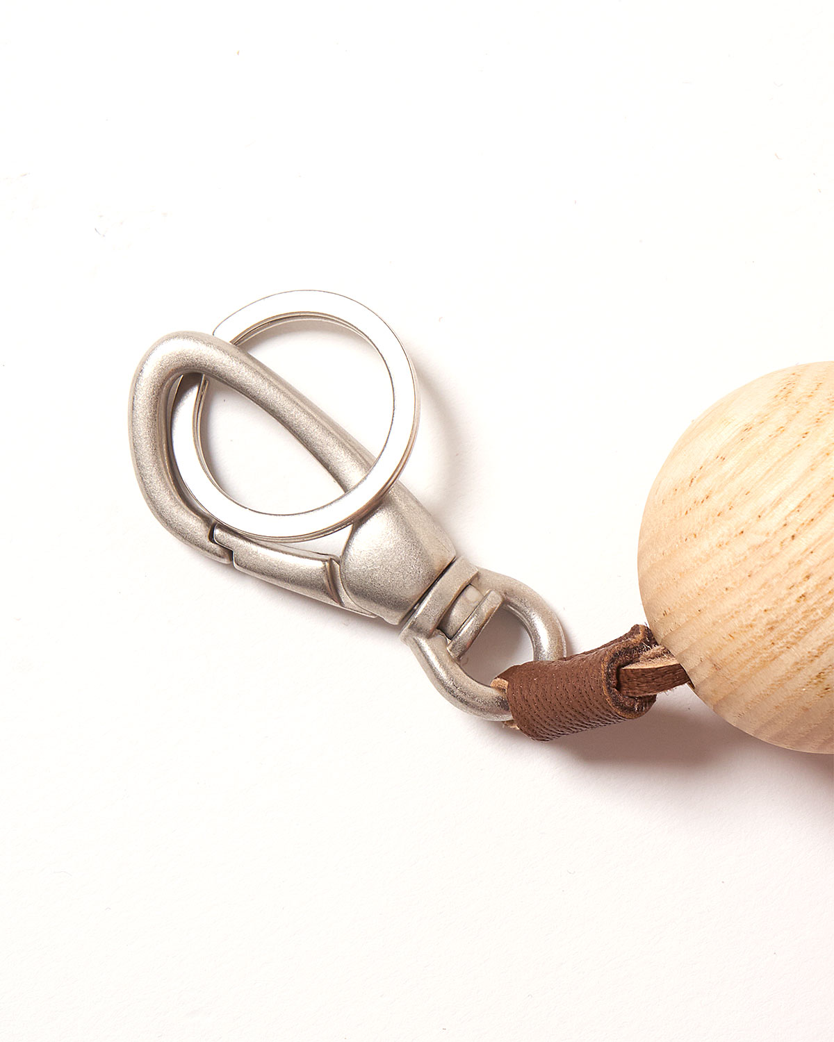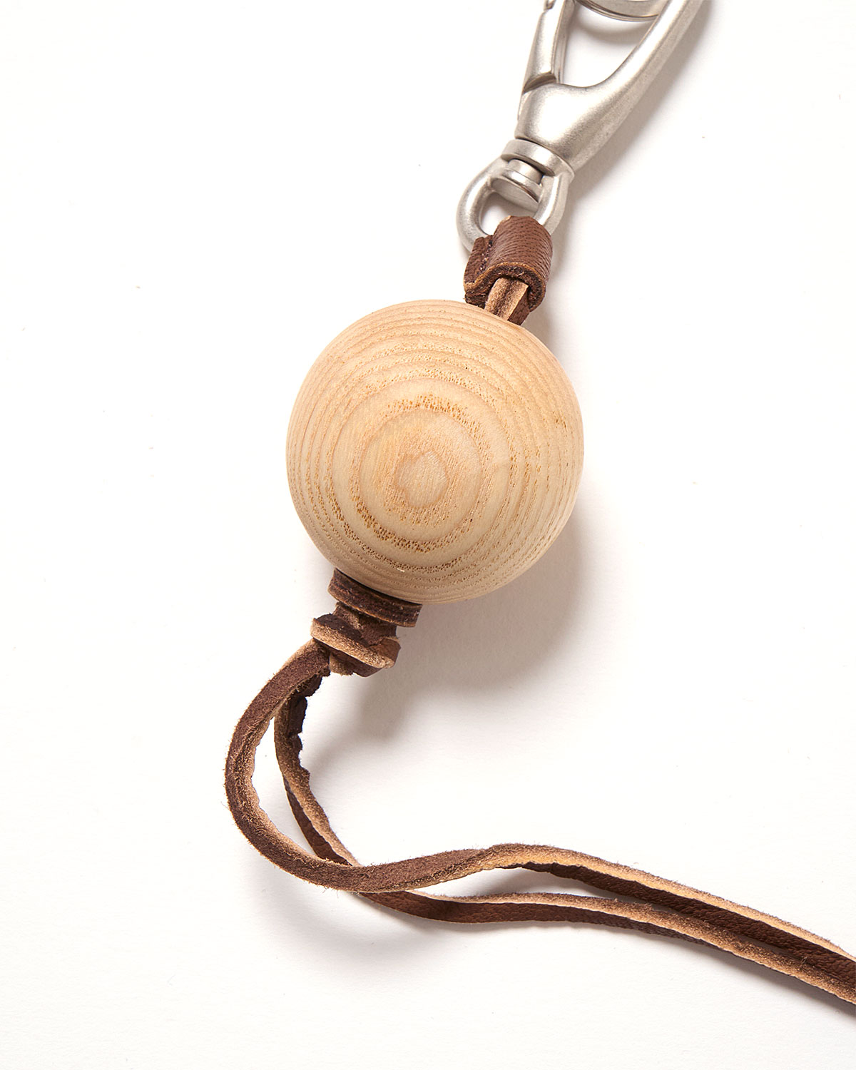 ラウンドカットのウッドビーズを使用したキーリング。天然木の端材を使用し、一点ごとに異なる木目が特徴です。質感高いディアレザーのストラップは長めに設定してあり、お好みの長さにカットしてアレンジもお楽しみいただけます。