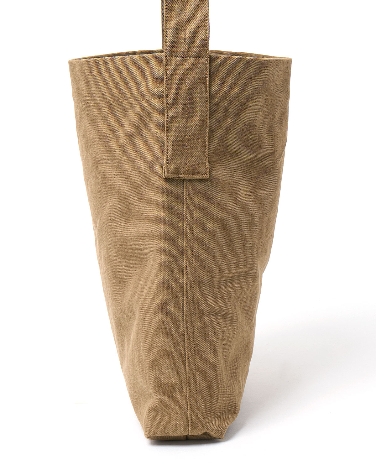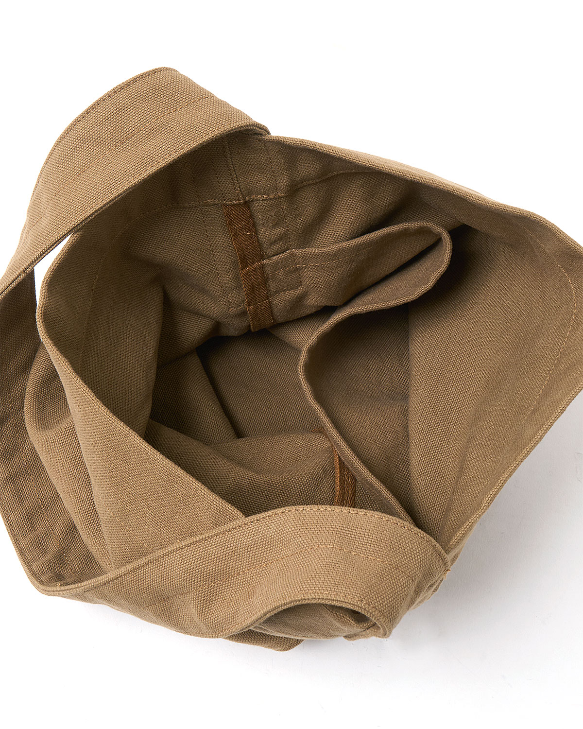 タテA4サイズにシンプルなストラップを組みわせたワンショルダーバッグ。とにかくシンプルにノートPCを持ち運びたくて、最低限の容量に余計なものは一切足さず、小さな内ポケットだけ付けてミニマムに仕上げました。ストラップの調節はありませんが、肩掛けと手持ちがちょうどこなせる絶妙な長さに設定しています。