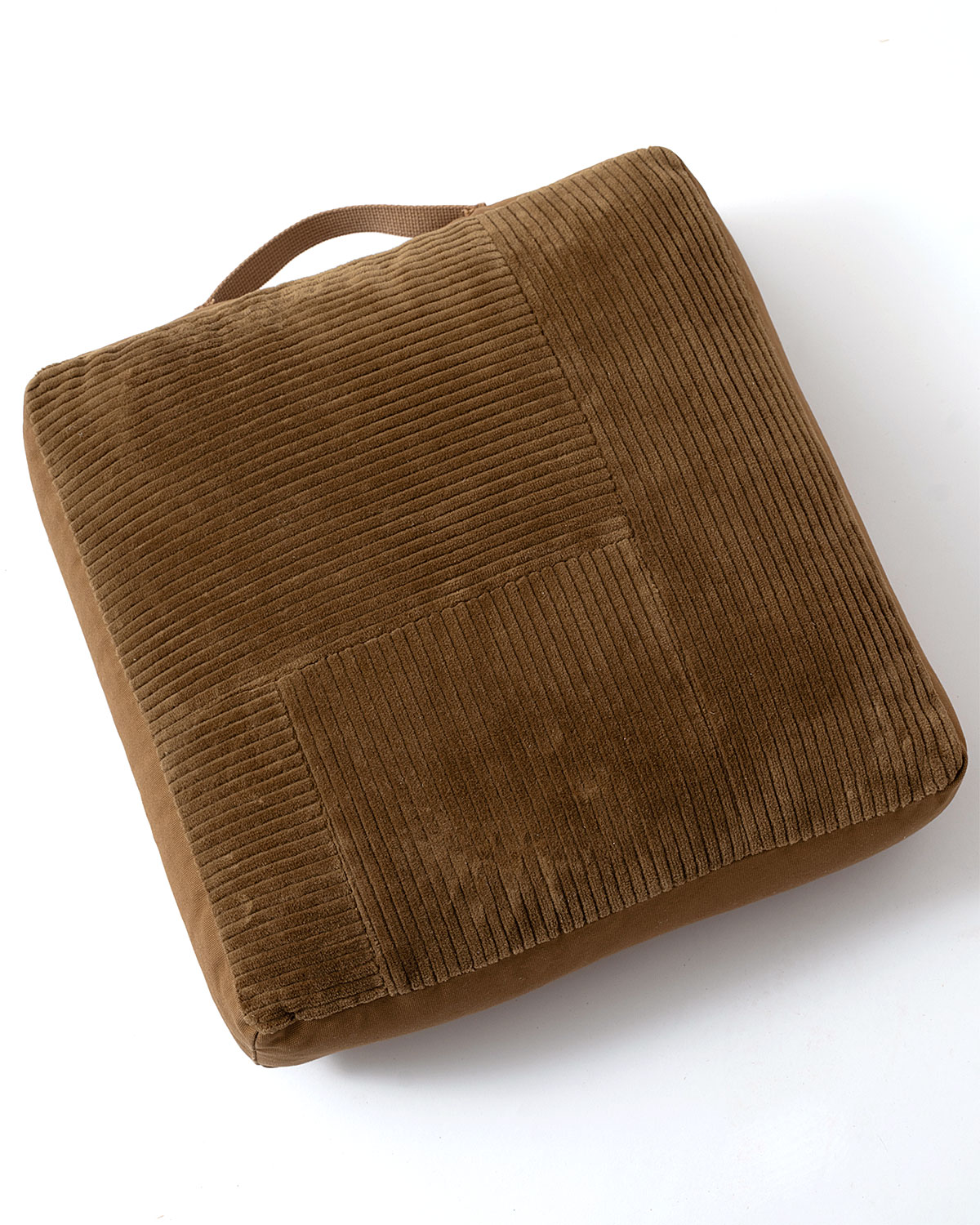 太畝のコーデュロイをパッチワーク生地にした敷くタイプのクッション。2サイズ展開のSサイズです。古いジーンズをリペアしたような、立体感のあるパッチワークが素材の表情を引き立てます。はじめは若干の張りと硬さがありますが、使い込むことでやわらかくなりフィット感が向上していきます。