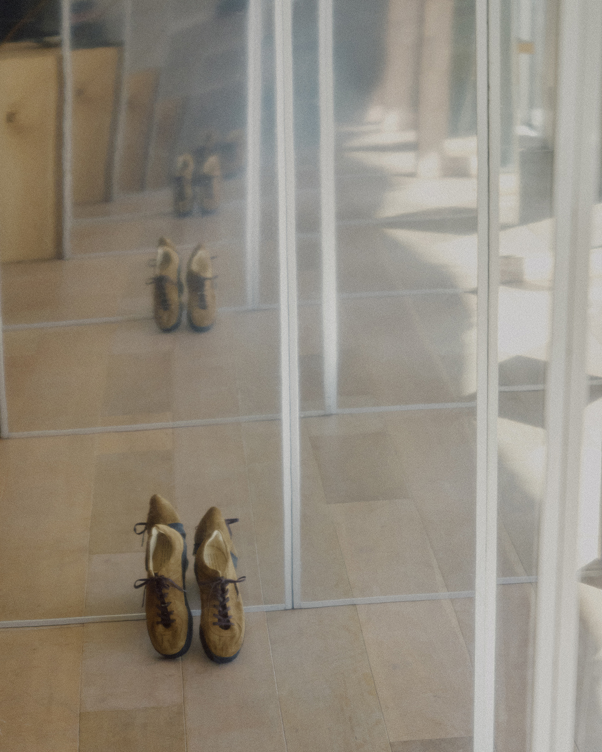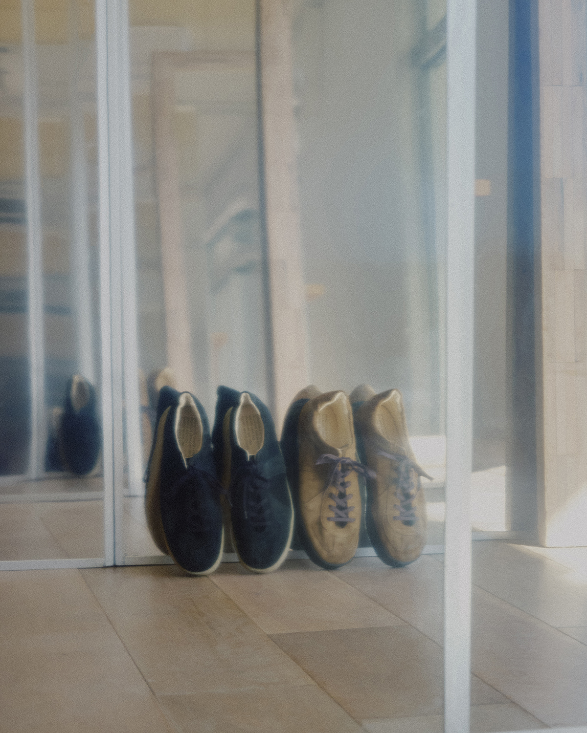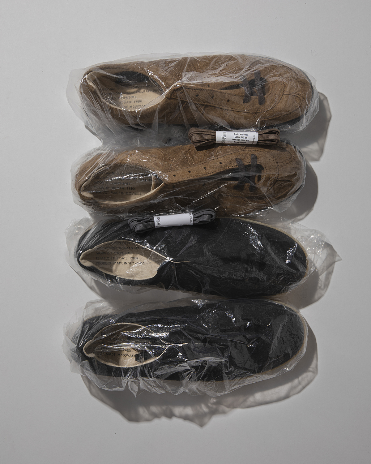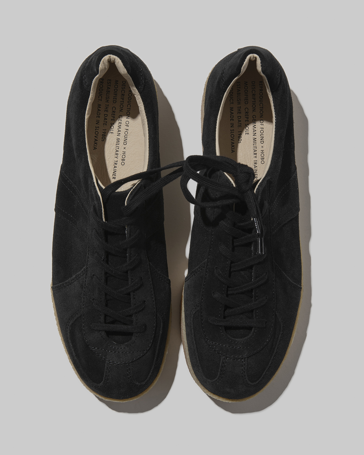 〈REPRODUCTION OF FOUND〉の現代的解釈によって蘇ったトレーニングシューズの名作「GERMAN TRAINER」をベースに、〈hobo〉の美意識をによってアレンジされた別注モデルが登場。 アッパーをオールスエード仕様へとアップデート。素材には、1958年創業のイタリア老舗レザーメーカー〈MASTROTTO〉社による上質なスエードレザーを採用した。ライニングとインソールの要所には、ピッグレザーをあて足当たりの良さを高めている。 アウトドアギアのような堅実さと機能性を目指し、天然クレープソールを採用することで、 柔らかな履き心地と静音性、天然素材ならではの温かみ、そして高いグリップ力を兼ね備える。 カラーはブラウンとブラックの2色。アウトドアにも都市のスタイルにも馴染む落ち着いたトーンは、スウェットパンツのようなラフな装いにも、堅実な印象をもたらす。 〈hobo〉のフィルターを通し、エイジングまでを見据え素材を厳選し仕上げた、オールスエードの特別な「GERMAN TRAINER」。