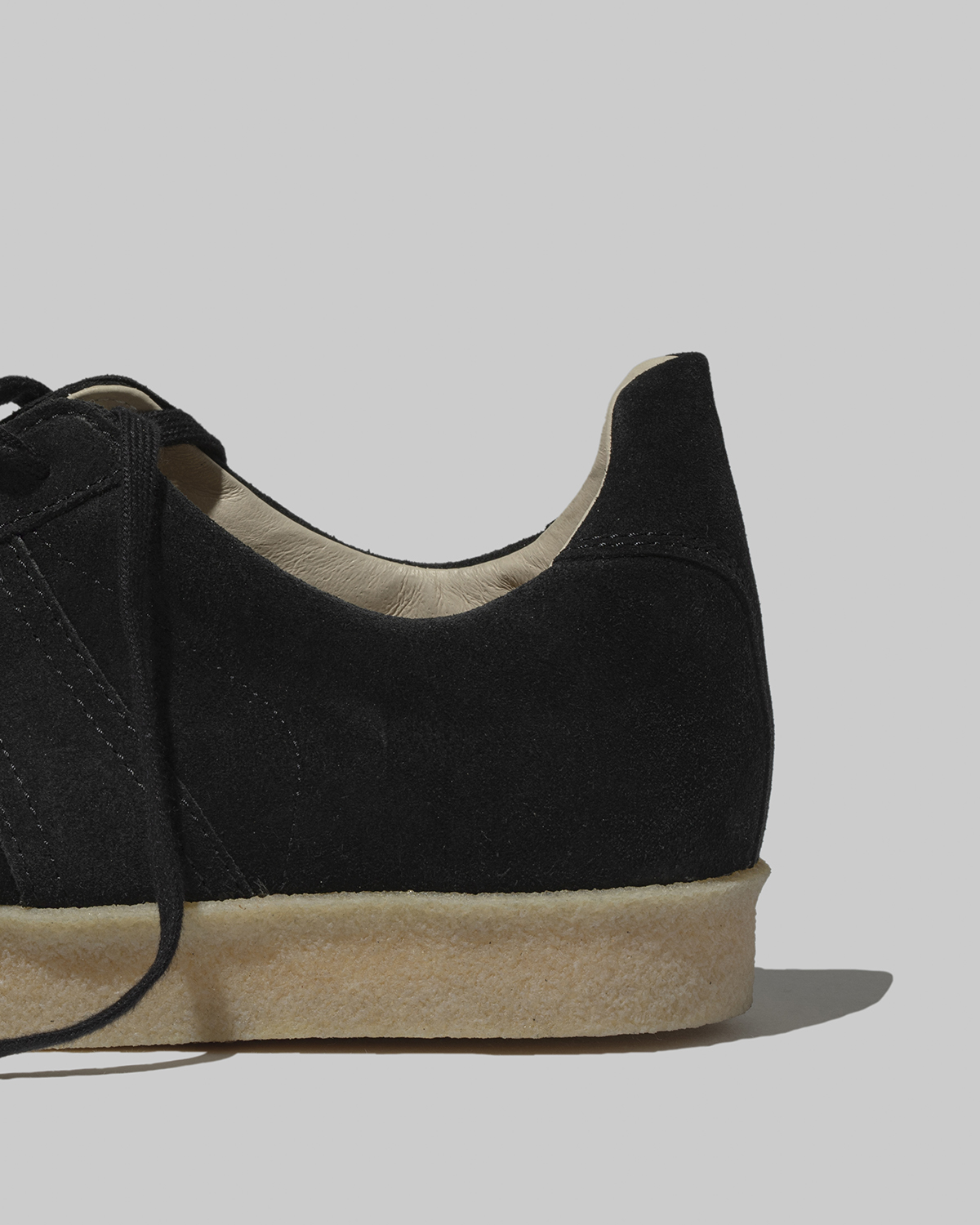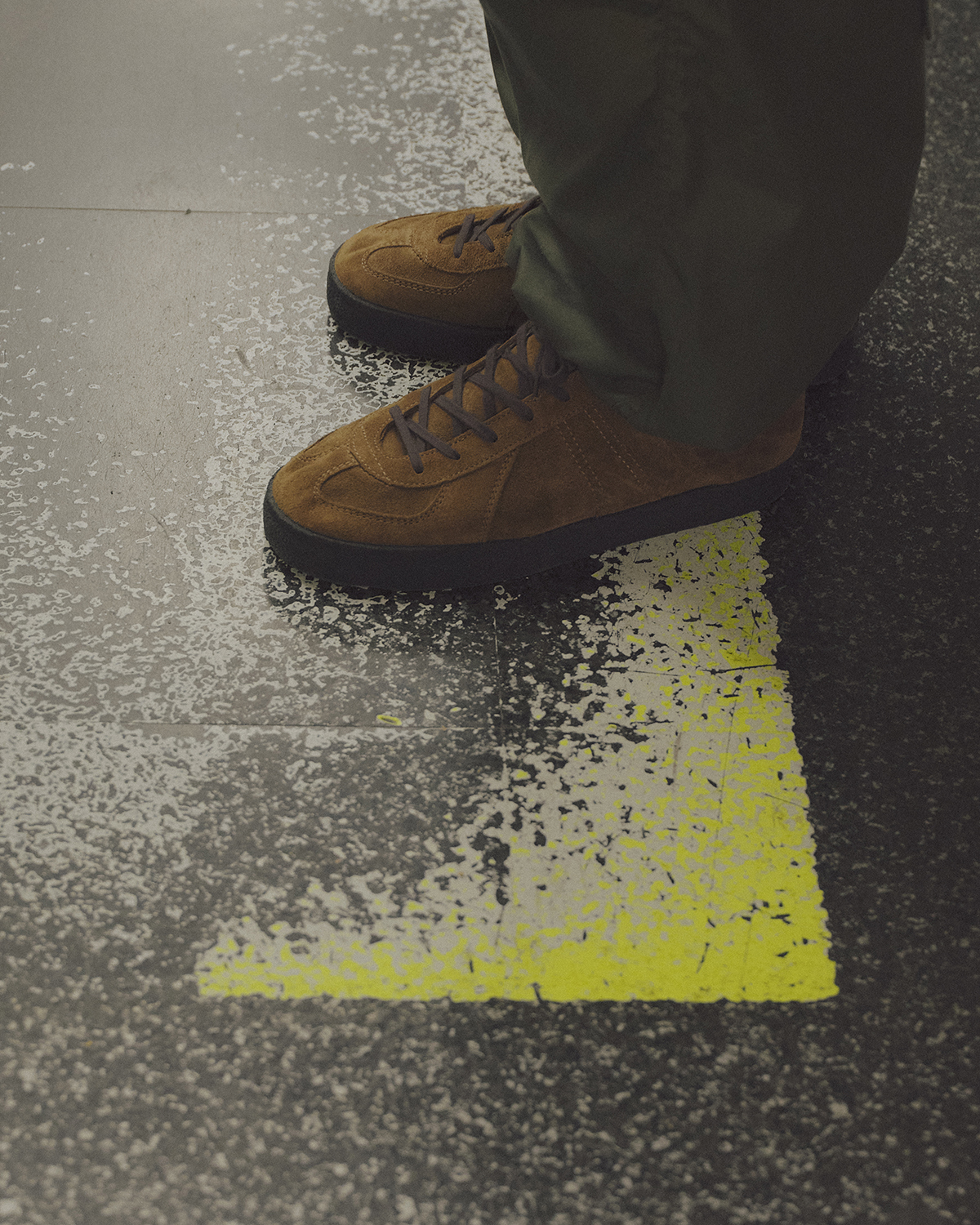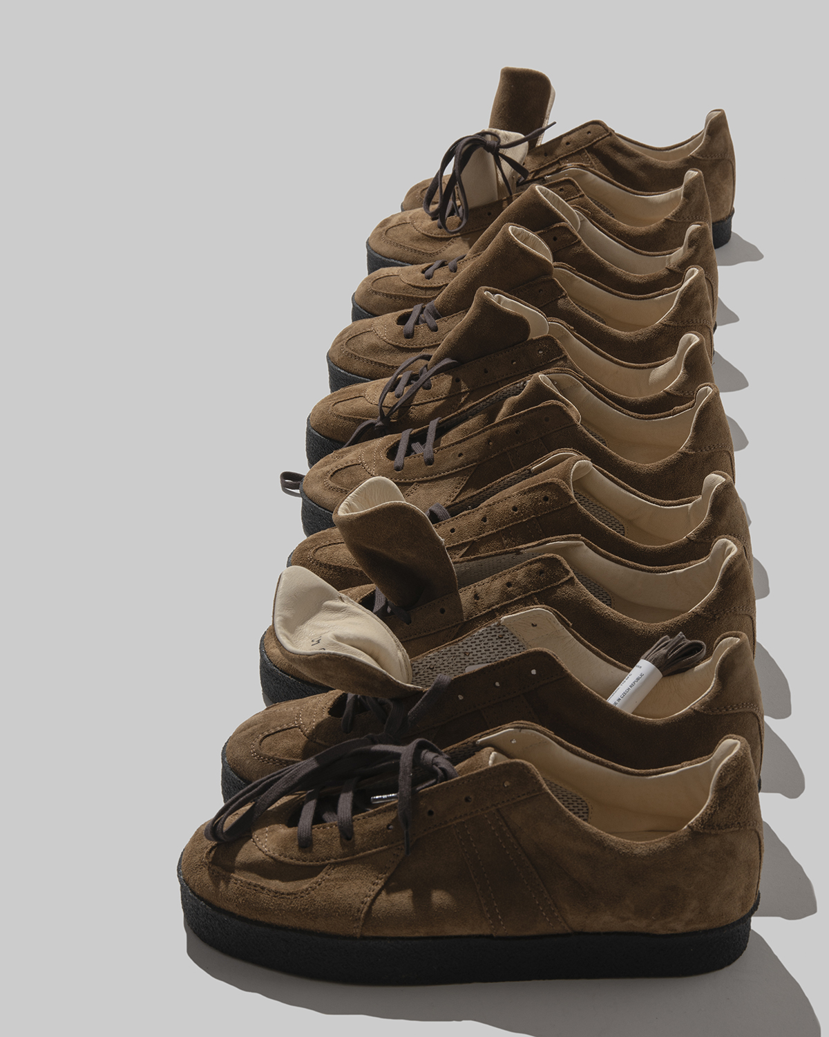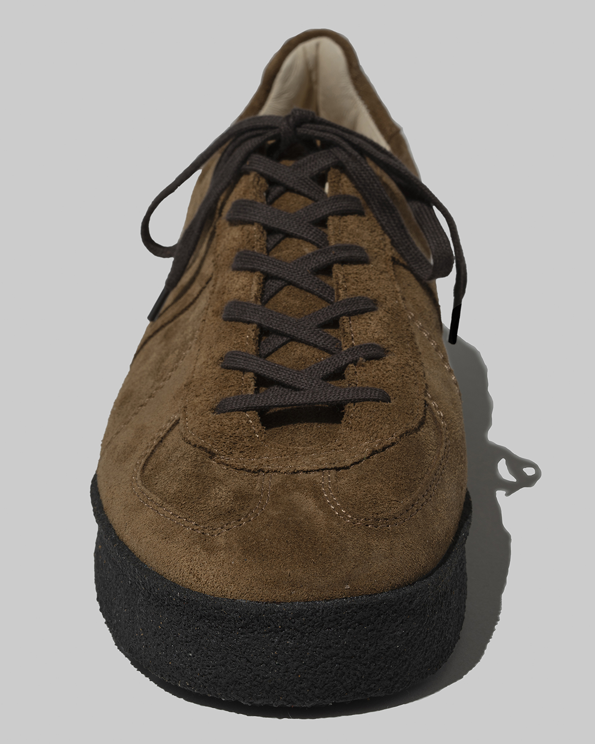 天然クレープソールを採用したモディファイドモデル「GERMAN TRAINER COW SUEDE」。 1980年代にドイツ軍に採用されていたトレーニングシューズ、通称“ジャーマントレーナー”をベースに、]当時軍用シューズを生産していたファクトリーへ依頼し、現代的な解釈で再構築した一足である。 つま先保護のためのトゥのカッティングは、機能性を追求したデザインながら、いまやミリタリースニーカーを象徴するディテールのひとつだ。 アッパーには上質なイタリアンスエードレザーを使用。ライニングとインソールにはピッグレザー使うことで、足あたりの良さを高めている。 スエードレザーは、1958年に創業したイタリアの老舗レザーメーカー〈MASTROTTO〉社によるもの。メゾンブランドからも支持を集める、世界最大級のレザーメーカーとして知られている。 コットン100%の6mm幅シューレースには、200年以上の歴史を誇るチェコの老舗シューレースファクトリー〈Odetka〉社の製品を採用。 〈hobo〉のフィルターを通し、オールスエードのアッパーをワントーンでまとめた、珠玉の別注モデルが誕生した。