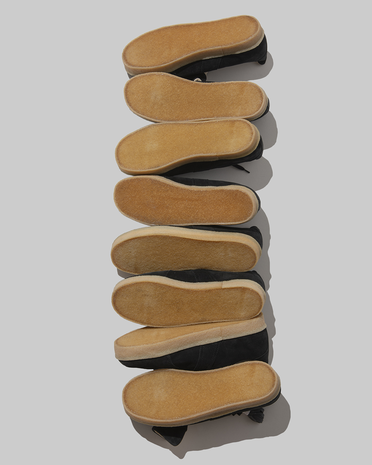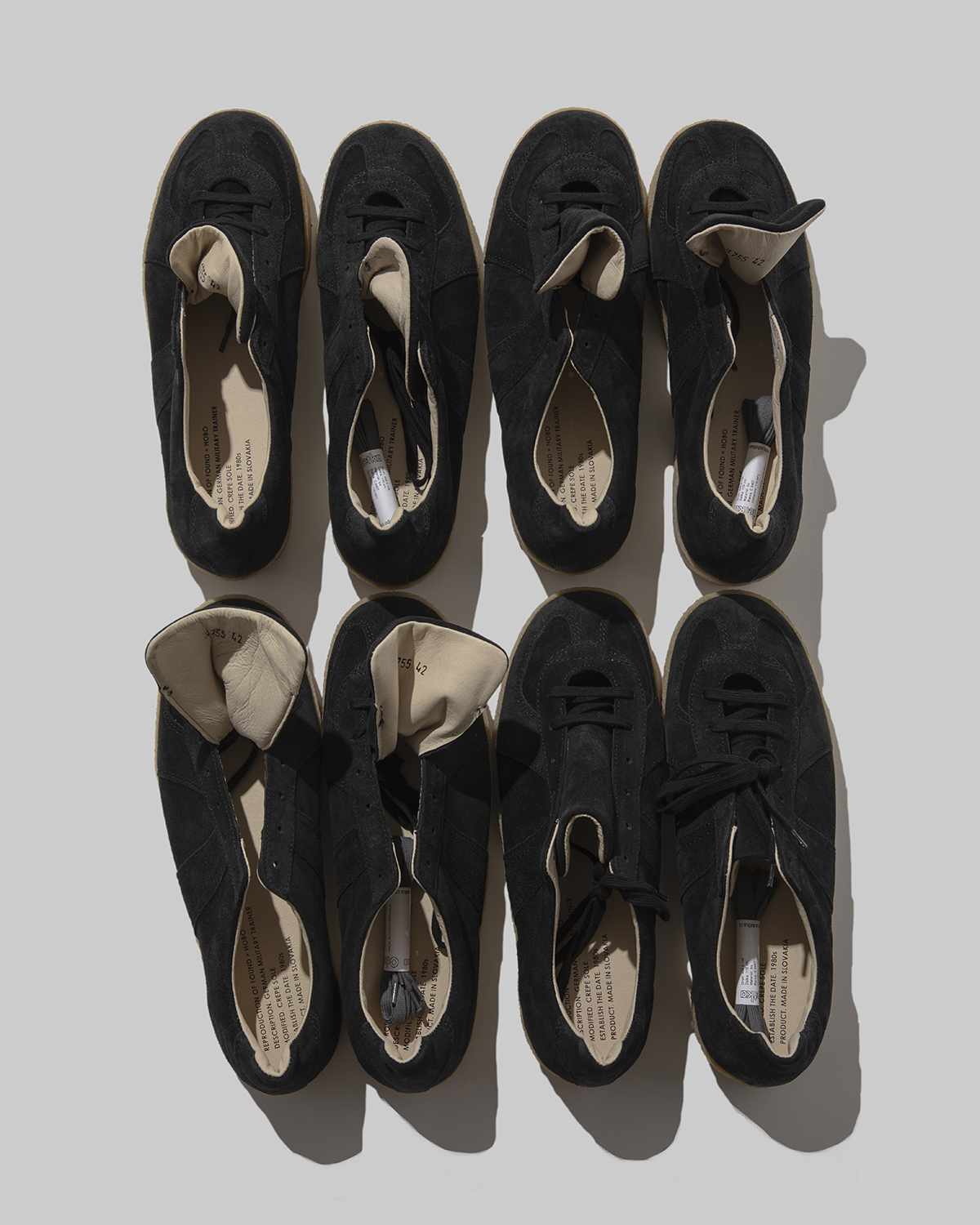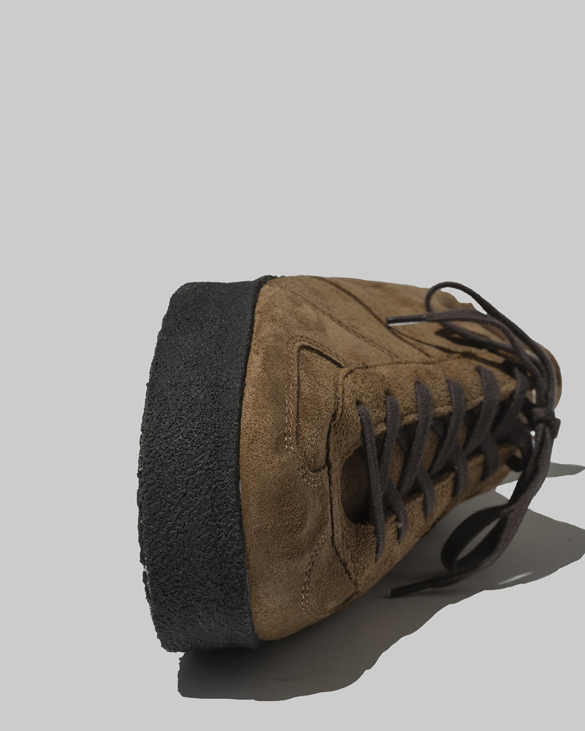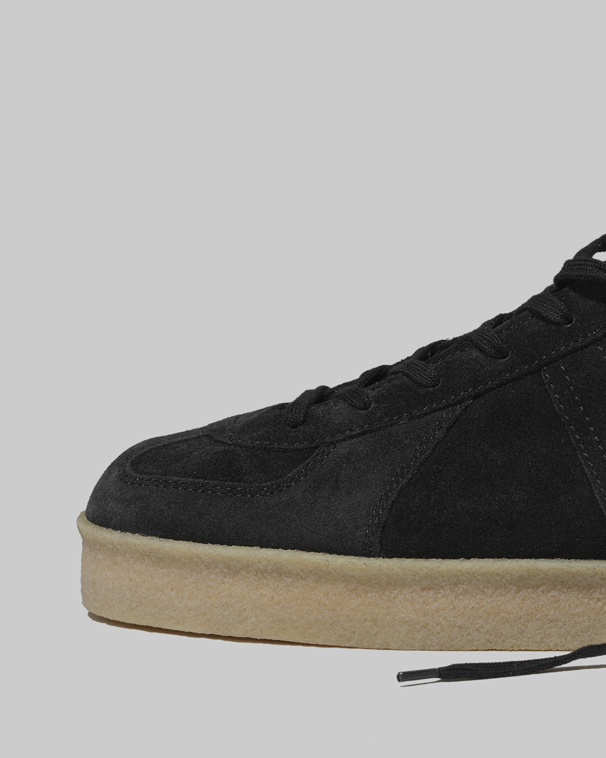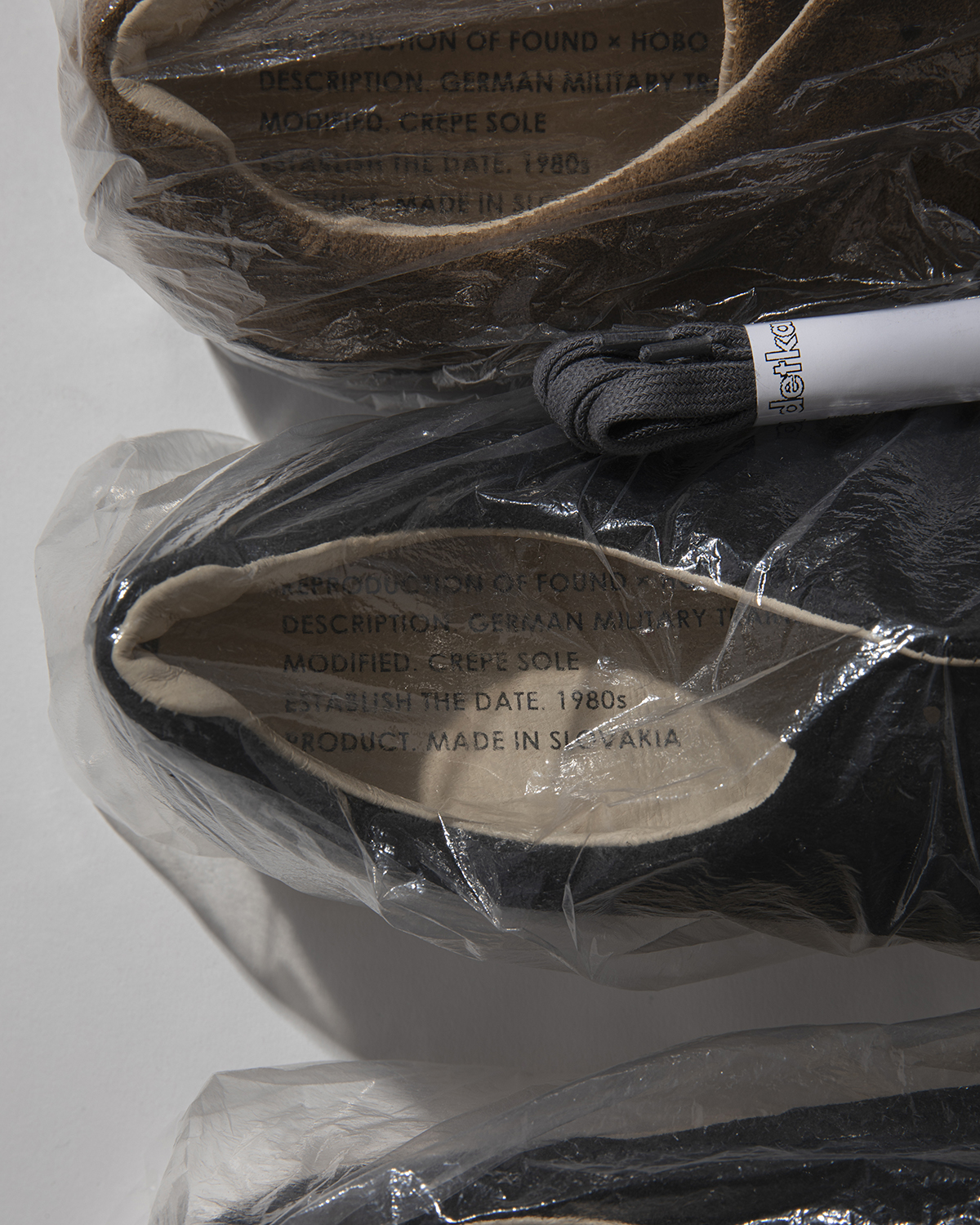 天然クレープソールを採用したモディファイドモデル「GERMAN TRAINER COW SUEDE」。 1980年代にドイツ軍に採用されていたトレーニングシューズ、通称“ジャーマントレーナー”をベースに、]当時軍用シューズを生産していたファクトリーへ依頼し、現代的な解釈で再構築した一足である。 つま先保護のためのトゥのカッティングは、機能性を追求したデザインながら、いまやミリタリースニーカーを象徴するディテールのひとつだ。 アッパーには上質なイタリアンスエードレザーを使用。ライニングとインソールにはピッグレザー使うことで、足あたりの良さを高めている。 スエードレザーは、1958年に創業したイタリアの老舗レザーメーカー〈MASTROTTO〉社によるもの。メゾンブランドからも支持を集める、世界最大級のレザーメーカーとして知られている。 コットン100%の6mm幅シューレースには、200年以上の歴史を誇るチェコの老舗シューレースファクトリー〈Odetka〉社の製品を採用。 〈hobo〉のフィルターを通し、オールスエードのアッパーをワントーンでまとめた、珠玉の別注モデルが誕生した。