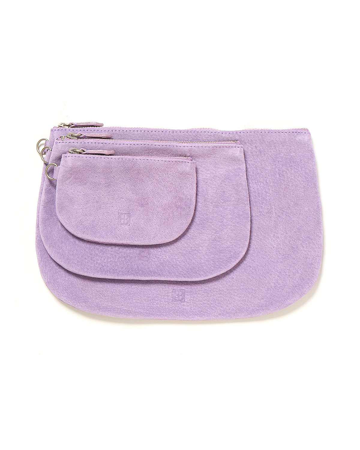 シンプルがゆえに何にでも使えるレザーポーチ。鍵の収納に、また小銭やカードを入れた財布として、その他イヤホンやコスメポーチなど様々な用途に使える3サイズ展開です。側面に小さなD環を設けており、同素材で展開するレザーストラップを組み合わせての使用もお勧めです。SS26シーズンは発色の良さが目を惹くラベンダーとイエローを追加。