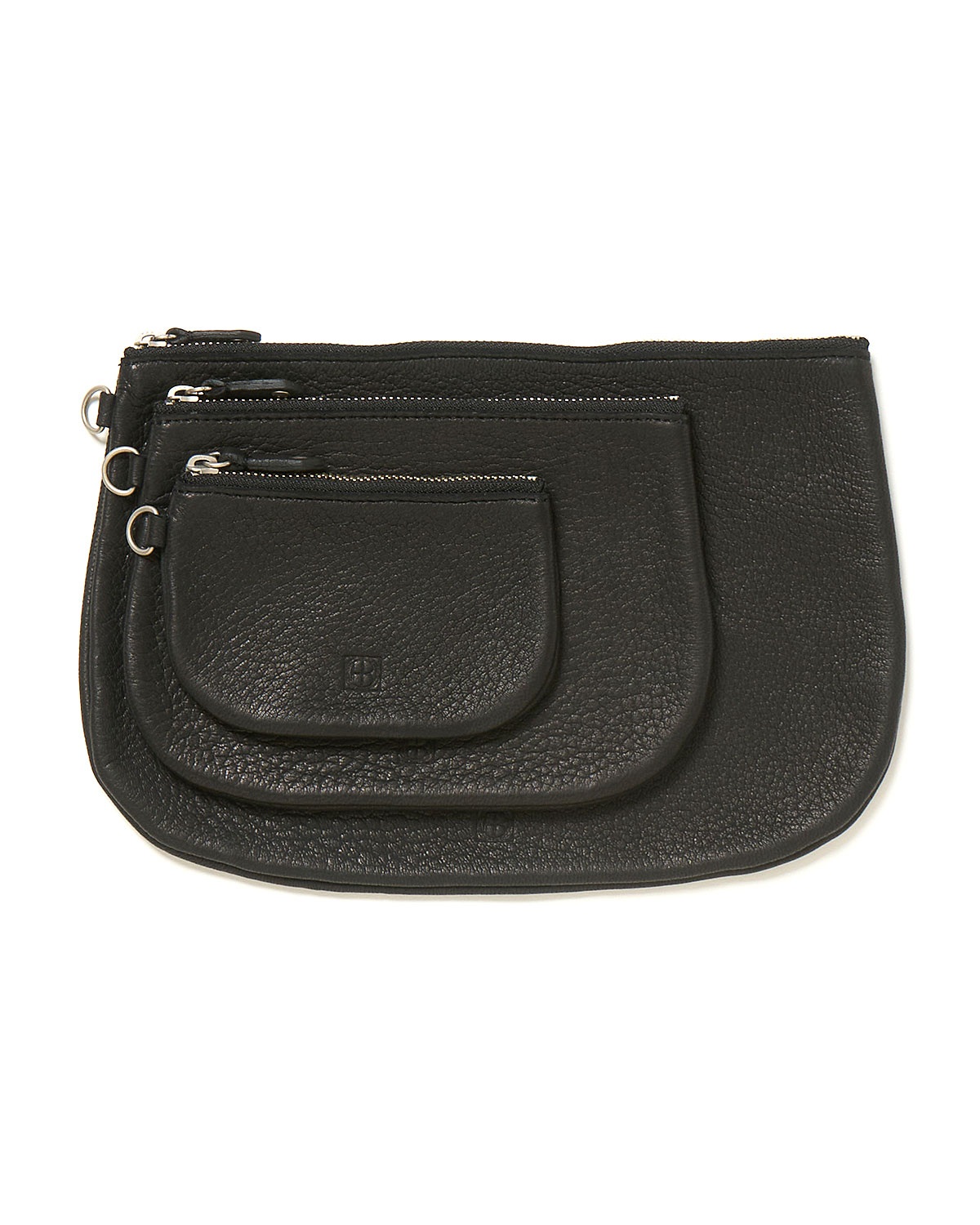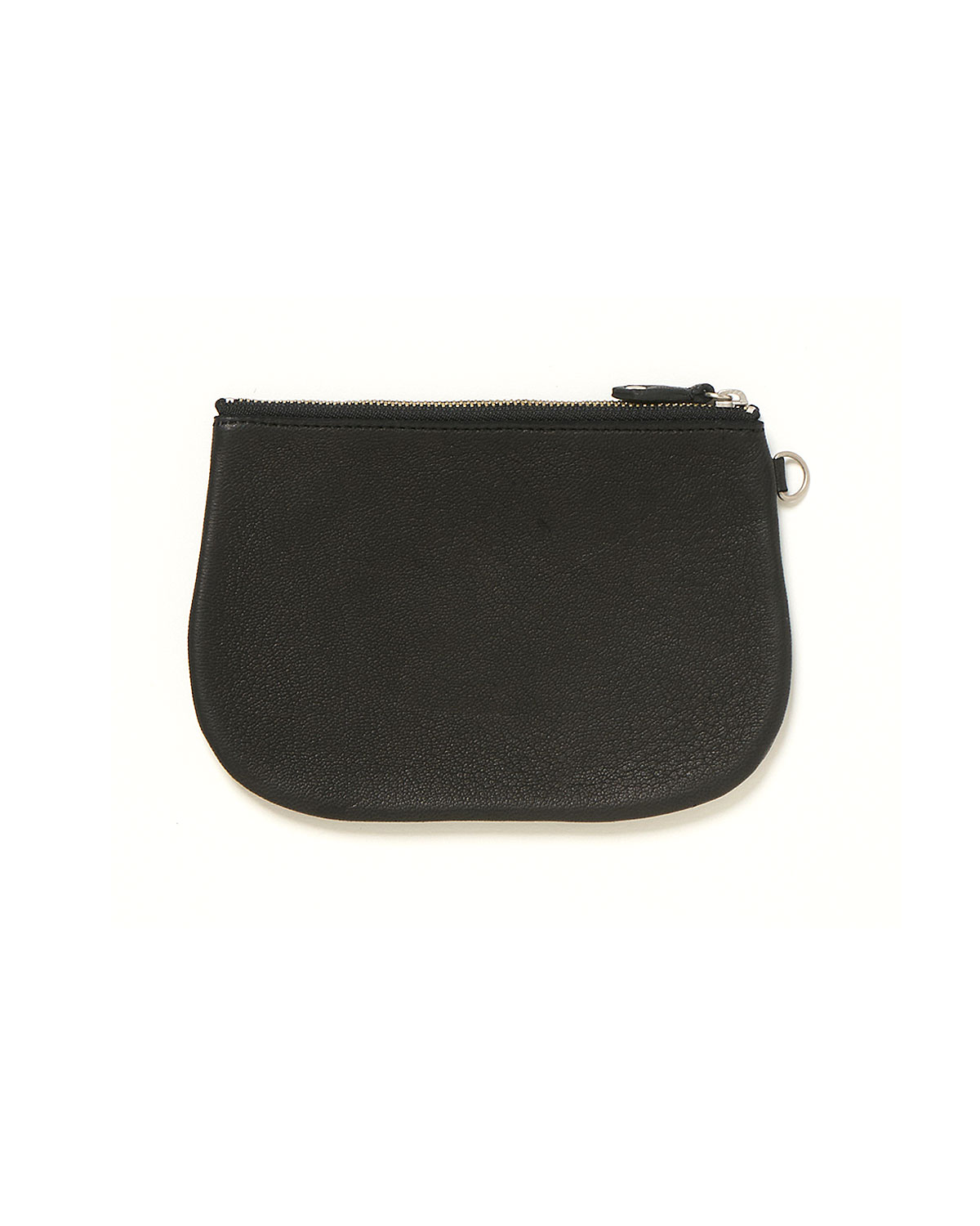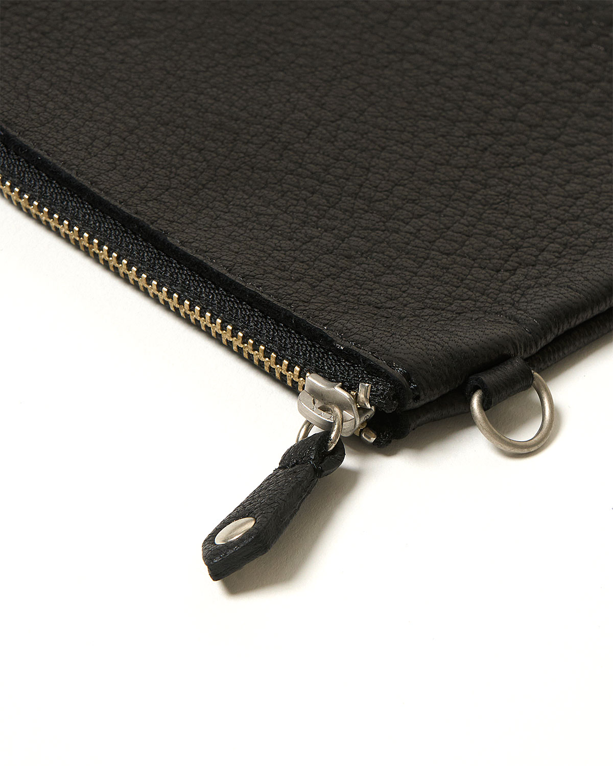 シンプルがゆえに何にでも使えるレザーポーチ。鍵の収納に、また小銭やカードを入れた財布として、その他イヤホンやコスメポーチなど様々な用途に使える3サイズ展開です。側面に小さなD環を設けており、同素材で展開するレザーストラップを組み合わせての使用もお勧めです。